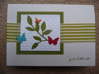 My card above uses the Big Shot Sizzlits Birds & Blooms dies and the one below uses Sizzlits Little Leaves along with Embosslits die Beautiful Wings. Please excuse the obviously crooked ribbon placement on that card. A late night card making session obviously had me not seeing straight!!!! I didn’t notice it until I loaded the photo on here!